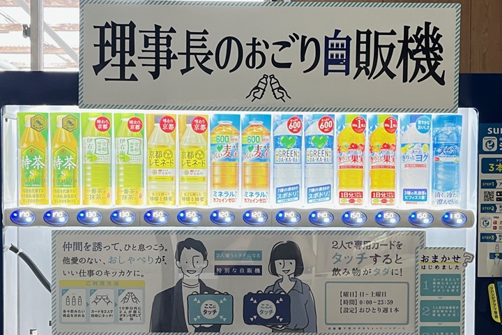 2人で専用カードをタッチすると飲み物を無料でゲット、職員同士のつながりや会話のきっかけになればと思います。